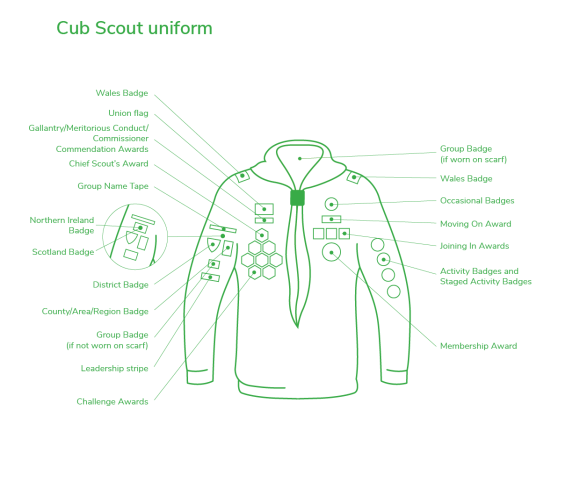 The Cub uniform consist's of a green Cub jumper, Group neckerchief and Group t-shirt.